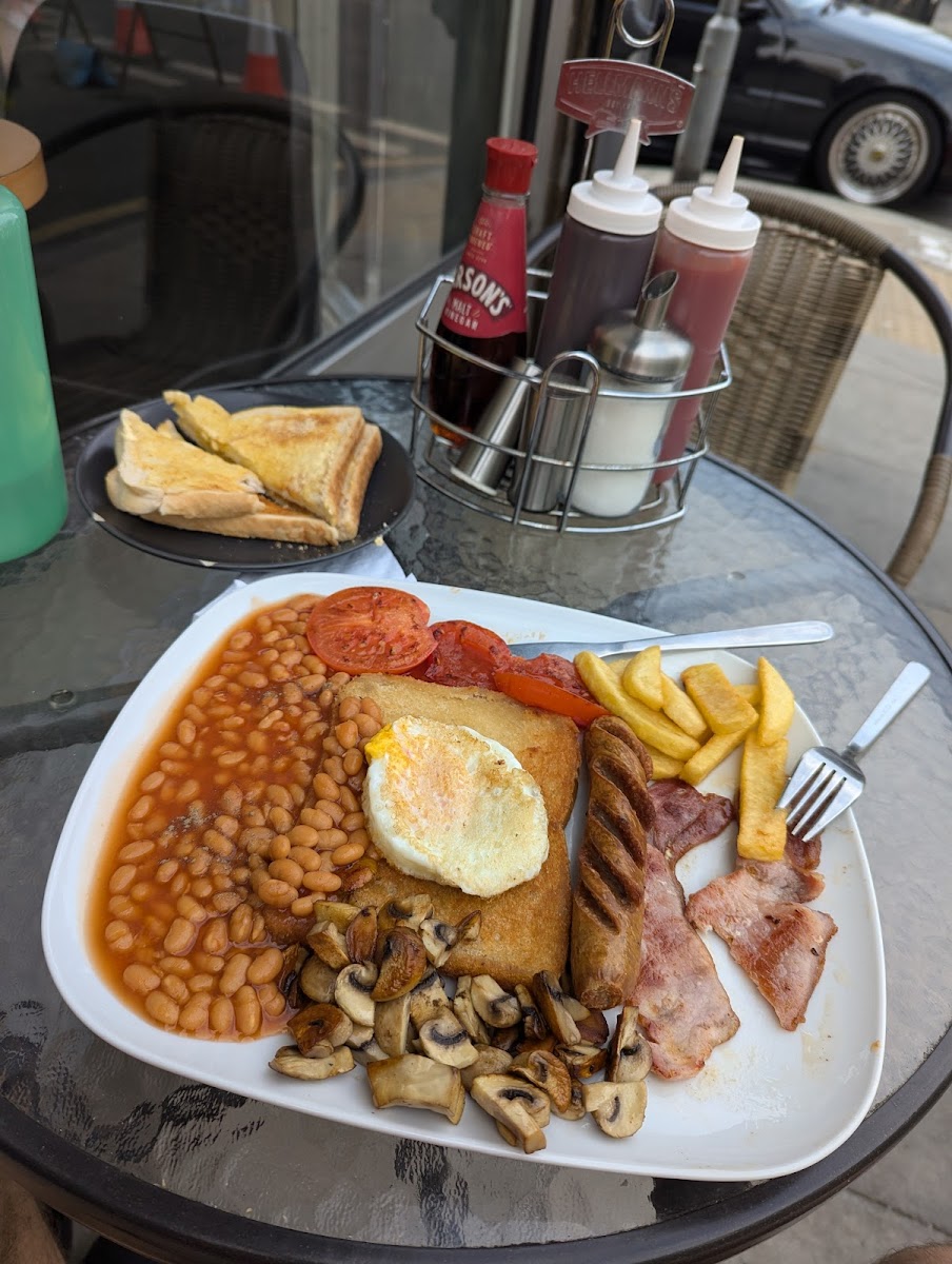 Banger of a full English in a local cafe. This is a no-frills place that does breakfast right. The guys were quick on service, with good chat, and brought out good food. Good toast with egg, tasty beans and mushrooms, and nice slices of bacon. The portion size was perfect for a hungry guy and enough to get me going for the rest of the day. Great prices, too, which will make me come around more often, too.